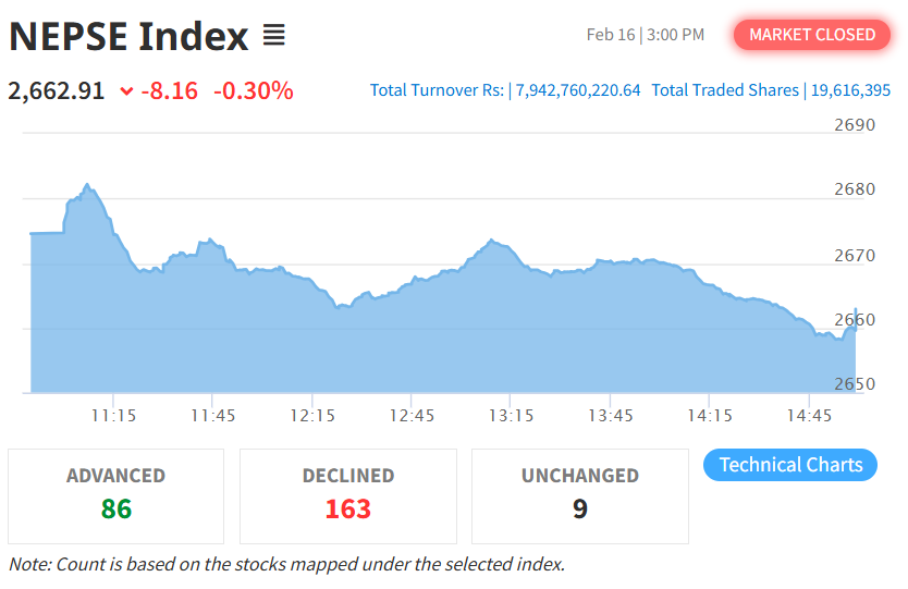कारोबार रकमसँगै नेप्सेमा गिरावट, अधिकांश उपसमूह ओरालो