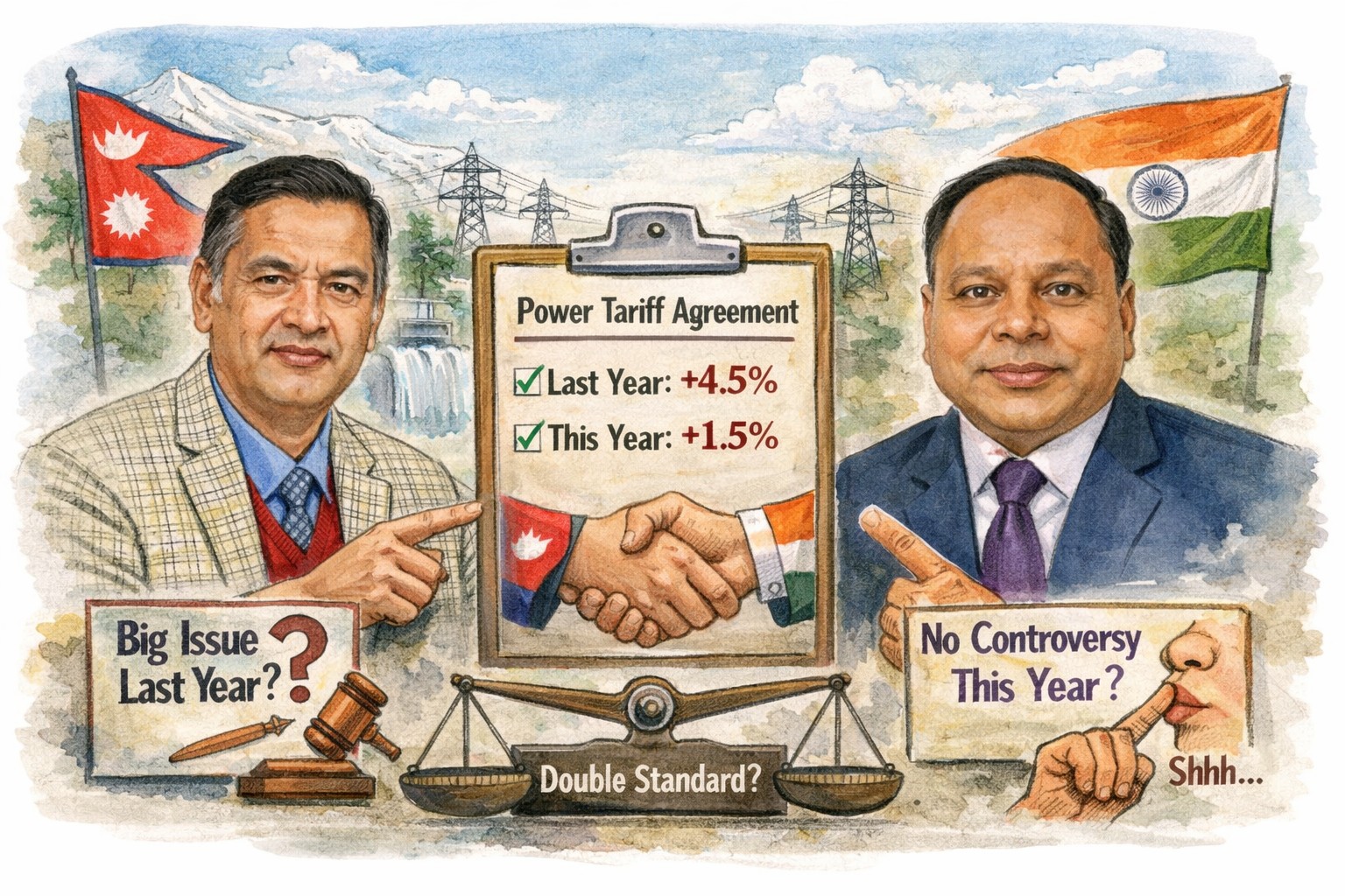 नेपालले हाल दैनिक करिब १२ देखि १४ हजार मेगावाट-घण्टा विद्युत् आयात गरिरहेको छ र सुख्खा मौसममा यो परिमाण अझ बढ्ने अनुमान छ। त्यसैले भारतसँगको विद्युत् सहमति आवश्यकता हो, विलासिता होइन। तर ऊर्जा प्रशासनको विश्वसनीयता केवल सम्झौता गरेर मात्र जोगिँदैन; त्यही निर्णयबारे सरकार र मन्त्रालयले अपनाउने मापदण्डमा स्थिरता हुनु पनि उत्तिकै आवश्यक हुन्छ। यदि दरवृद्धि र आयात समझदारी आवश्यक थिए भने पोहोर त्यसलाई व्यक्तिगत निशाना बनाउन किन प्रयोग गरियो? र यदि साँच्चिकै प्रक्रियागत गम्भीर समस्या थियो भने अहिले उही मोडालिटीमा भएको निर्णय किन सहज मानियो?