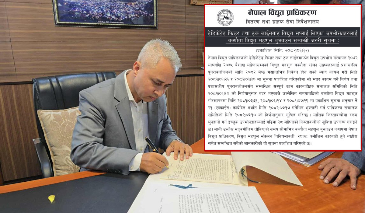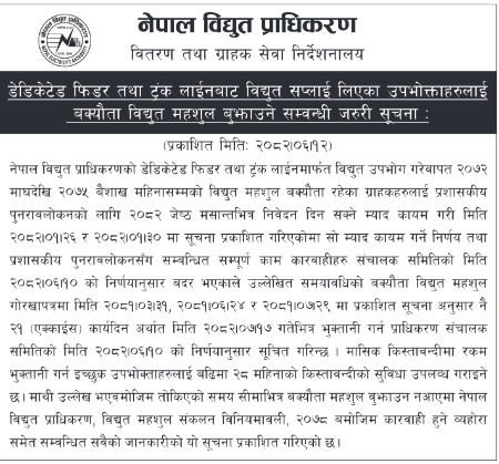 काठमाडौँ: नेपाल विद्युत प्राधिकरणले डेडिकेटेड र ट्रंकलाइनमार्फत विद्युत् आपूर्ति लिने उद्योगी तथा व्यापारीलाई २१ दिनभित्र बक्यौता महशुल बुझाउन कडाइका साथ निर्देशन दिएको छ । प्राधिकरणले जारी गरेको सूचनामा तत्काल रकम नतिर्ने ग्राहकको नामसहित विवरण सार्वजनिक गर्ने र आपूर्ति समेत बन्द गर्ने चेतावनी दिइएको छ ।