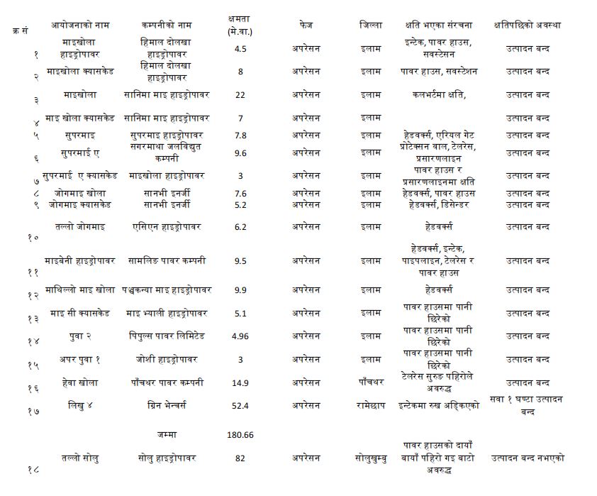 बाढी–पहिरोबाट ३२ जलिविद्युत् आयोजना प्रभावित, इलाममा मात्रै १६ आयोजनामा क्षति (सूचीसहित)