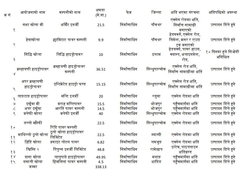 सिन्धुपाल्चोकमा रहेका ३६.५१ मेगावाटको ब्रम्हायणी, १५.१५ मेगावाटको माथिल्लो ब्रम्हायणी, ४० मेगावाटको बलेफी र २२.५ मेगावाटको तल्लो बलेफी आयोजनाको पहुँचमार्ग समेत बाढीले बगाएको छ । त्यस्तै, रसुवाको २० मेगावाट लाङटाङ खोला, भोजपुरको १५.५ मेगावाट इर्खुवा खोला बी र १४.५ मेगावाट माथिल्लो इर्खुवा, म्याग्दीको २२.५ मेगावाट माथिल्लो ठूलो खोला, लमजुङको ६.८२ मेगावाट हिडी खोला, रामेछापको ४८.८ मेगावाट खिम्ति २ र धादिङको ४.५ मेगावाट गसाली खोला आयोजना पनि क्षतिग्रस्त भएका छन् ।