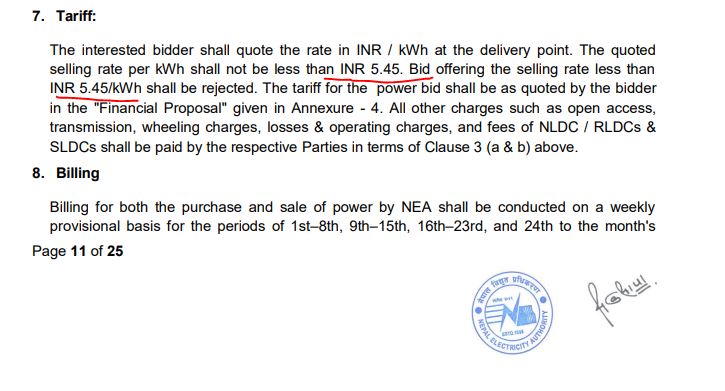 निर्देशक थापाले आज निकालेको ५ सय मेगावाट बिजुली बिक्रीको बोलपत्रमा सन् २०२६ को जून १ देखि नोभेम्बरको ३० सम्म (कुल १८३ दिन) पाँच वर्षका लागि हो ।