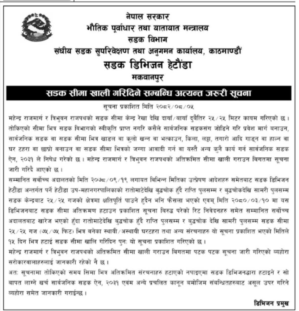 सहमतिपछि सडक डिभिजनले आवश्यक प्रक्रिया अघि बढाउँदै सडक सीमा खाली गराउने तथा अतिक्रमण हटाउने कार्यका लागि औपचारिक सूचना जारी गरेको हो ।