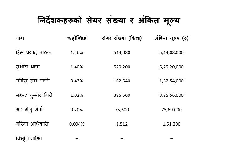 कम्पनीमा कुनै पनि निर्देशक ५ प्रतिशतभन्दा माथि नरहनु शक्ति केन्द्रीकरण नभएको संकेत हो। यसले निर्णय प्रक्रियामा सामूहिकता र संस्थागत संरचना बलियो हुने पक्षलाई पनि समर्थन गर्न सक्छ।