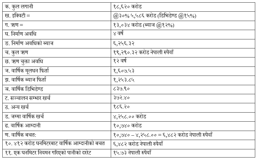 १. १,२०० मेगावाटको विद्युत् योजनाको कुल लागत प्रति मेगावाट २५ करोडका हिसाबले ३०,००० करोड नेपाली रुपैयाँ
