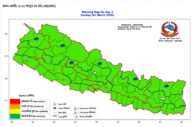 विभागले आज (फागुन १७ गते) जारी गरेको ‘डे-२ वार्निङ म्याप’ अनुसार सुदूरपश्चिम, कर्णाली, गण्डकी र बागमती प्रदेशका पहाडी तथा हिमाली जिल्लामा वर्षा र हिमपातको संकेत देखिएको छ। केही स्थानमा मध्यम वर्षा हुन सक्ने अनुमान गरिएको छ।