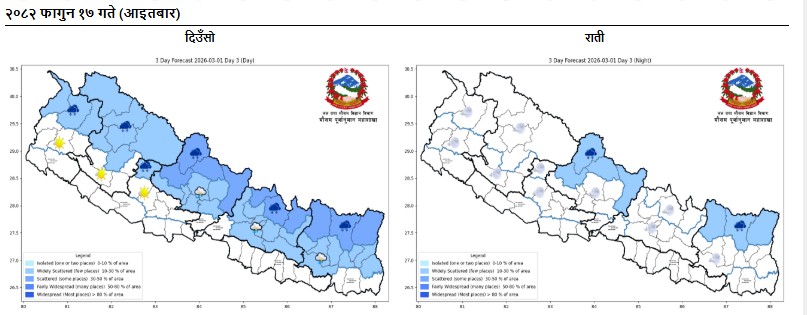 राति भने तराईका थोरै स्थानमा तुँवालो देखिन सक्नेछ। कोशी र गण्डकी प्रदेशका हिमाली क्षेत्रमा साधारणतया बदली रहनेछ भने ती प्रदेशका पहाडी भू-भाग तथा अन्य हिमाली क्षेत्रमा आंशिक बदली हुने जनाइएको छ। बाँकी भू-भागमा भने मौसम मुख्यतया सफा रहनेछ। कोशी र गण्डकी प्रदेशका हिमाली क्षेत्रमा एक-दुई स्थानमा मेघगर्जनसहित हल्का वर्षा वा हिमपातको सम्भावना कायम रहेको छ।
