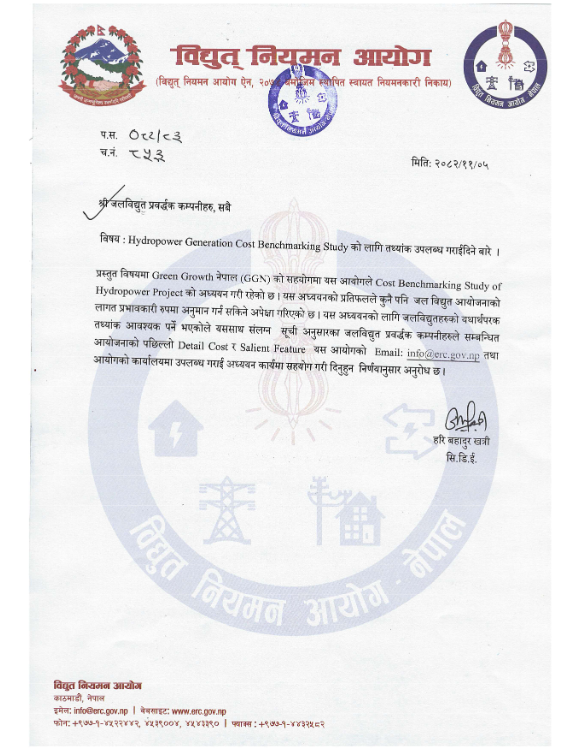 आयोगले हरित विकास नेटवर्क (GGN) सँगको सहकार्यमा जलविद्युत् परियोजनाको लागत संरचना अध्ययन गरिरहेको जनाएको छ। अध्ययनबाट भविष्यमा बन्ने जलविद्युत् आयोजनाको यथार्थपरक लागत निर्धारण, नीति निर्माण तथा नियामकीय व्यवस्थापनमा सहयोग पुग्ने अपेक्षा गरिएको छ।