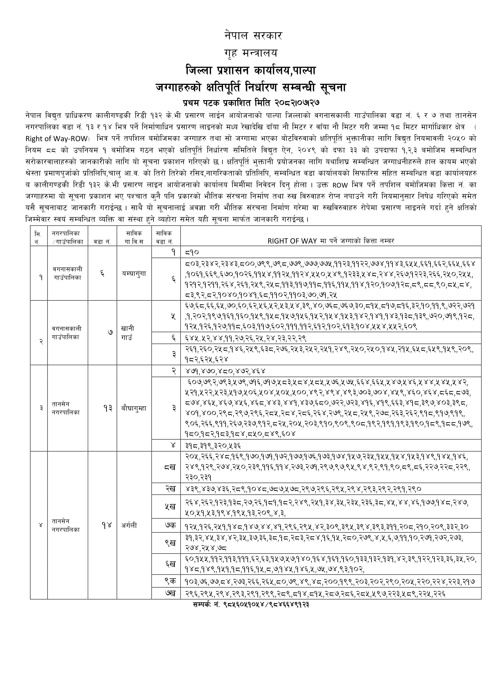 जिल्ला प्रशासन कार्यालय पाल्पाले बिहीबार सार्वजनिक सूचना जारी गर्दै बगनासकाली गाउँपालिका–६ र ७ तथा तानसेन नगरपालिका–१३ र १४ भित्र पर्ने प्रसारण लाइन मार्गअन्तर्गतका जग्गाधनीहरूलाई क्षतिपूर्ति लिन आवश्यक कागजातसहित निवेदन दिन आग्रह गरेको हो ।