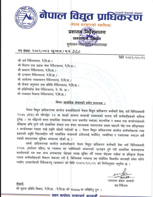 काठमाडौं: नेपाल विद्युत प्राधिकरणले आफ्ना कर्मचारीलाई सामाजिक सञ्जाल प्रयोग गर्दा संस्थाको गरिमा, सेवा नियमावली र आचारसंहिता पालना गर्न निर्देशन दिएको छ । शुक्रबार प्राधिकरणको प्रशासन निर्देशनालय, जनसम्पर्क शाखाले एक सूचना जारी गर्दै सामाजिक सञ्जालको प्रयोग जिम्मेवार र मर्यादित हुनुपर्ने स्पष्ट पारेको हो ।