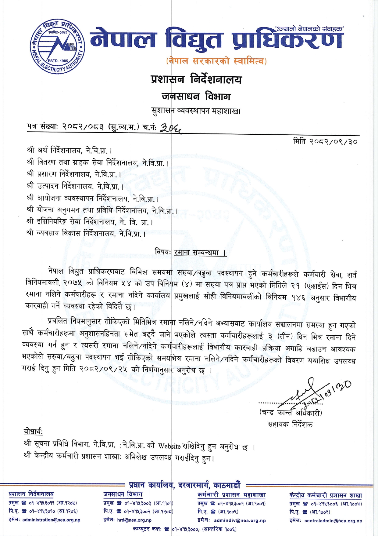 कर्मचारी सेवा, शर्त विनियमावली–२०७५ को विनियम ५४ को उपविनियम (४) अनुसार सरुवा वा बढुवा पत्र प्राप्त भएको मितिले २१ दिनभित्र रमाना लिनुपर्ने व्यवस्था छ । तर पछिल्लो समय उक्त व्यवस्था पालना नगर्ने प्रवृत्ति बढ्दै गएको भन्दै प्राधिकरणले गम्भीर ध्यानाकर्षण गराएको छ ।