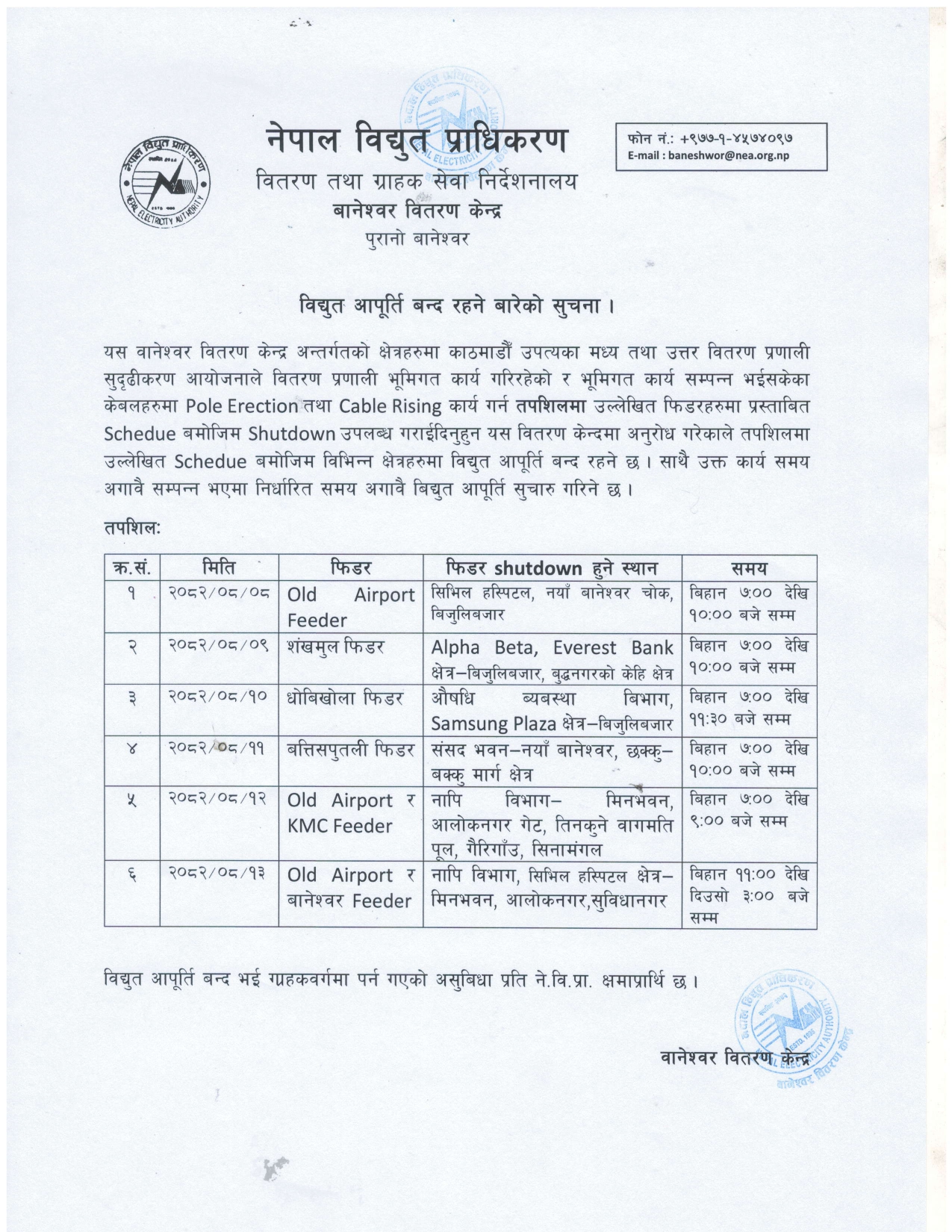 निर्धारित Shutdown कार्यक्रमअनुसार तोकिएका मितिहरूमा बानेश्वर क्षेत्रका विभिन्न फिडरअन्तर्गत पर्ने स्थानहरूमा एक घण्टादेखि तीन घण्टासम्म बिद्युत् अवरुद्ध हुनेछ। काम सम्पन्न भएसँगै बिद्युत् सेवा पुनःसुचारु गरिने प्राधिकरणले जनाएको छ।