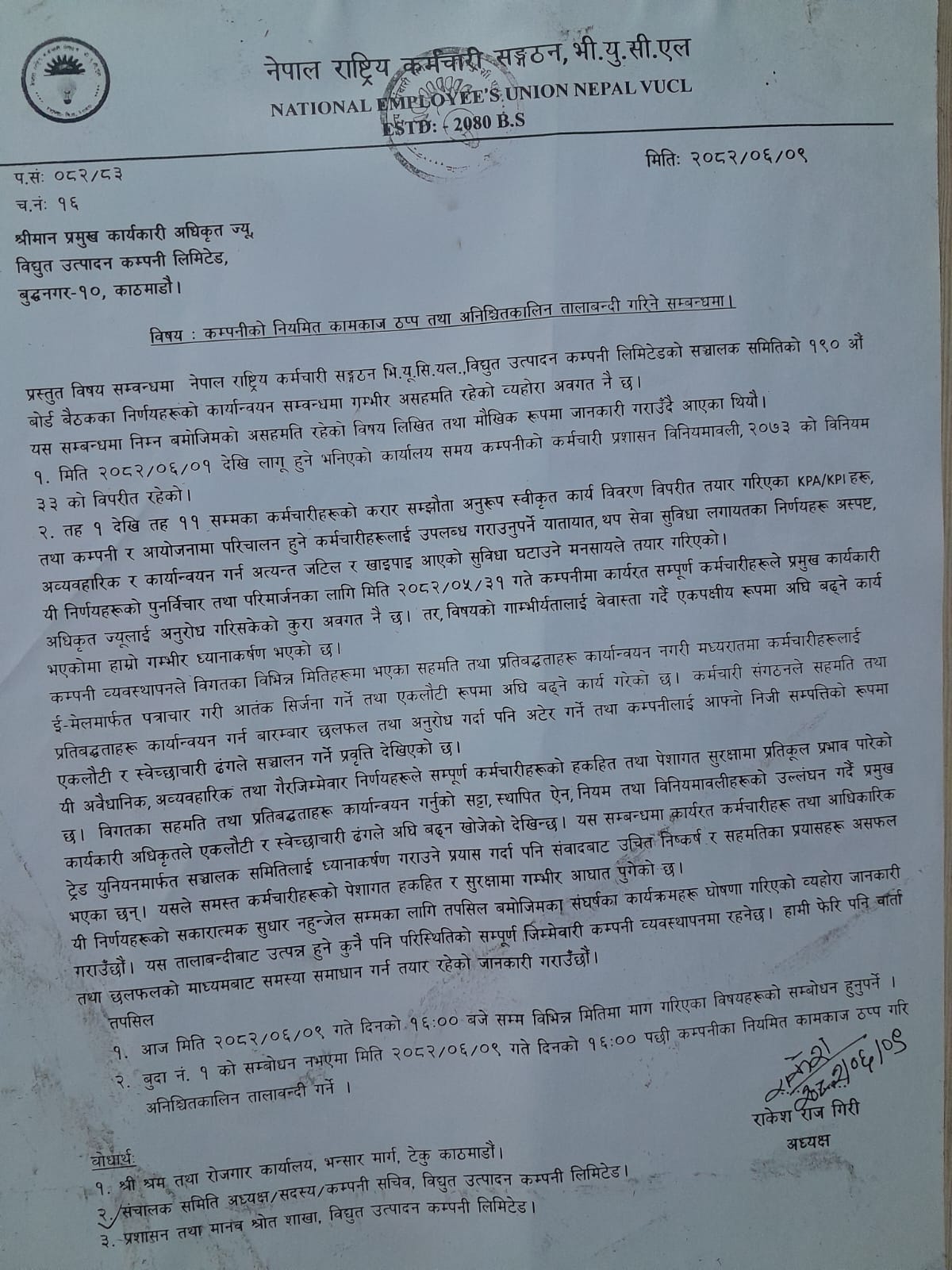 काठमाडौं बसी-बसी २५० प्रतिशतसम्म भत्ता खान नपाएपछि विद्युत् उत्पादन कम्पनीका कर्मचारीहरुले तालाबन्दी गरे