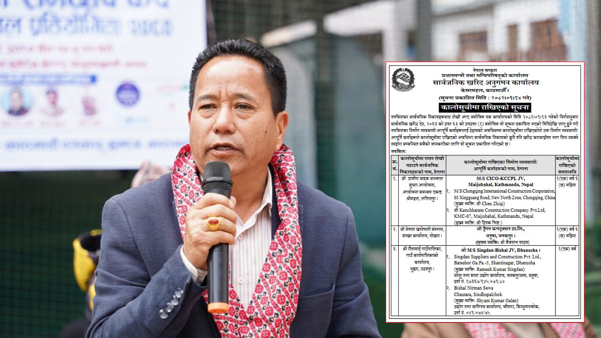 यसैगरी, उदयपुरको रौतामाई गाउँपालिकाको ठेक्का अन्तर्गत संयुक्त उपक्रम (जेभी) का रूपमा काम गरिरहेका धनुषाको सिङडन सप्लायर्स एण्ड कन्स्ट्रक्सन र सिन्धुपाल्चोकको विशाल निर्माण सेवा लाई एक वर्षका लागि कालोसूचीमा राखिएको छ ।