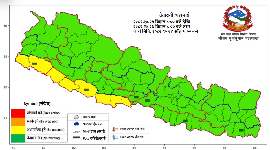 विभागको मौसम पूर्वानुमान महाशाखाले सार्वजनिक गरेको नक्शाअनुसार देशका अधिकांश जिल्ला हरियो रङले देखाइएका छन्, जसले हाल मौसम सामान्य अवस्थामा रहेको जनाउँछ। यद्यपि लुम्बिनी प्रदेश, सुदूरपश्चिम प्रदेश तथा मधेश प्रदेशका केही तराईका भू-भाग पहेँलो रङमा देखाइएका छन्, जहाँ मौसमसम्बन्धी जानकारी नियमित रूपमा अद्यावधिक गर्नुपर्ने अवस्था रहेको विभागको निष्कर्ष छ।