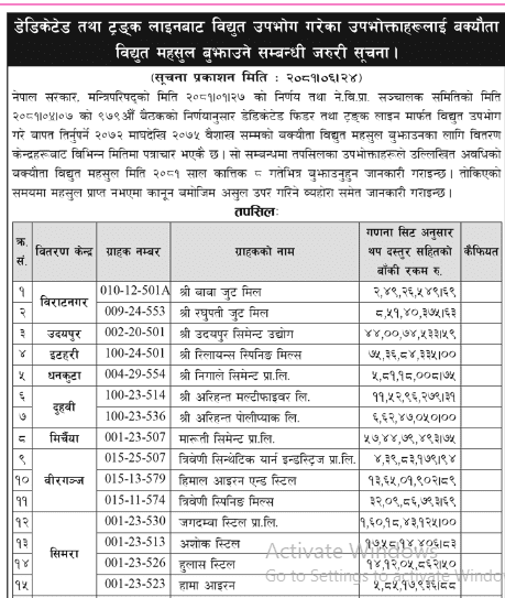 उक्त सूचना जारी भएपछि उद्योगहरुले बक्यौता तिर्ने मनसुवा देखाए । त्यसपछि प्राधिकरणले पहिलो किस्ता तिरेपछि मात्र लाइन जोडिने जनायो । एकपछि अर्काे गर्दै प्राधिकरणले २३ वटा उद्योगको लाइन काट्यो । लाइन काटिएपछि १४ उद्योगले पहिलो किस्ता बुझाएर लाइन जोडे । तर त्यसलाई केही उद्योगीहरुले पहिलो किस्ता नभई ‘धरौटी’ भन्दै आए । प्राधिकरणका निवर्तमान कार्यकारी निर्देशक मनोज सिलवालले केही दिनअघि दोस्रो किस्ता नतिरे लाइन काटिने पत्राचार गरे । त्यसपछि ठूला बक्यौताधारीमध्येका शिवम् सिमेन्ट र अर्घाखाँची सिमेन्टले सर्वाेच्च अदालतमा रिट निवेदन दायर गरे— गत कात्तिक (२०८२) २१ गते । उक्त रिटमाथि सु्नुवाई गर्दै सर्वाेच्च अदालतको संयुक्त इजलास (न्यायाधीशद्वय विनोद शर्मा र सुनीलकुमार पोखरेल) ले यही मंसिर २२ गते (२०८२) अन्तरिम आदेश दिन अस्वीकार गर्यो । न्यायाधीशद्वय शर्मा र पोखरेलको इजालसले करिब उक्त दिन चार बजे अन्तरिम आदेश नहुने गरेको फैसला चार बजे गरेको थियो । सोही दिन सर्वाेच्चका न्यायाधीश डा नहकु सुवेदी र श्रीकान्त पौडेलको इजलासमा बहस भइरहेको थियो । शर्मा र पोखरेलको इजलासले गरेका फैसला हावाले उडाएको आगोजस्तो फैलिसकेको थियो । अर्थात् बक्यौताधारी उद्योगीहरुको सातोपुत्लो उडेको थियो । तर स्ुवेदी र पौडेलको इजलासले शिवम् सिमेन्ट र अर्घाखाँची सिमेन्टको फैसला आइइसकेपछि रिट जारी गर्ने वा खारेज गर्ने निर्णय लिन चार घण्टा लगायो । एक अधिवक्ताका अनुसार खारेज हुने प्रकृतिको रिटमा निर्णय लिन रात कुर्नुपर्दैन । ती अधिवक्ताका अनुसार यो घटनाक्रम संयोग नभई ट्रंक तथा डेडिकेटेड लाइन उपयोग गरी बिजुली खपत गरेबापत बक्यौताधारीले तिर्नुपर्ने २२ अर्ब (महालेखापरीक्षकको प्रतिवेदन) उठाउने निर्णय गर्दा मनोज सिलवालको जागिर गएको हो । हितेन्द्रदेव शाक्य तिनै तत्कालीन कार्यकारी निर्देशक हुन् जो बक्यौताधारीका पक्षमा खुल्लम खुला रहेका तत्कालीन प्रधानमन्त्री केपी ओली र तत्कालीन ऊर्जा मन्त्री दीपक खड्काका आदेश शिरोपर गरी गैरकानुनी रुपमा प्रशासकीय पुनरावलोकन समिति गठन गरी बक्यौता नउठाउने प्रमुख भूमिका खेलेका थिए । ‘हितेन्द्रदेव शाक्यलाई पुनःस्थापित गराउनु भनेको बक्यौता नउठाउनु हो,’ ती अधिवक्ताले जलसरोकारसित भने । यो मुद्दामा सरकार पुनरावलोकनमा जान सक्ने कानुनी व्यवस्था छ ।