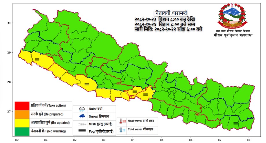 हाल देशका अधिकांश क्षेत्र ‘चेतावनी छैन’ (No Warning) श्रेणीमै रहे पनि मौसमको अवस्था छिटो परिवर्तन हुन सक्ने भएकाले नियमित मौसम बुलेटिन र अद्यावधिक सूचनामा ध्यान दिन जल तथा मौसम विज्ञान विभागले आग्रह गरेको छ ।