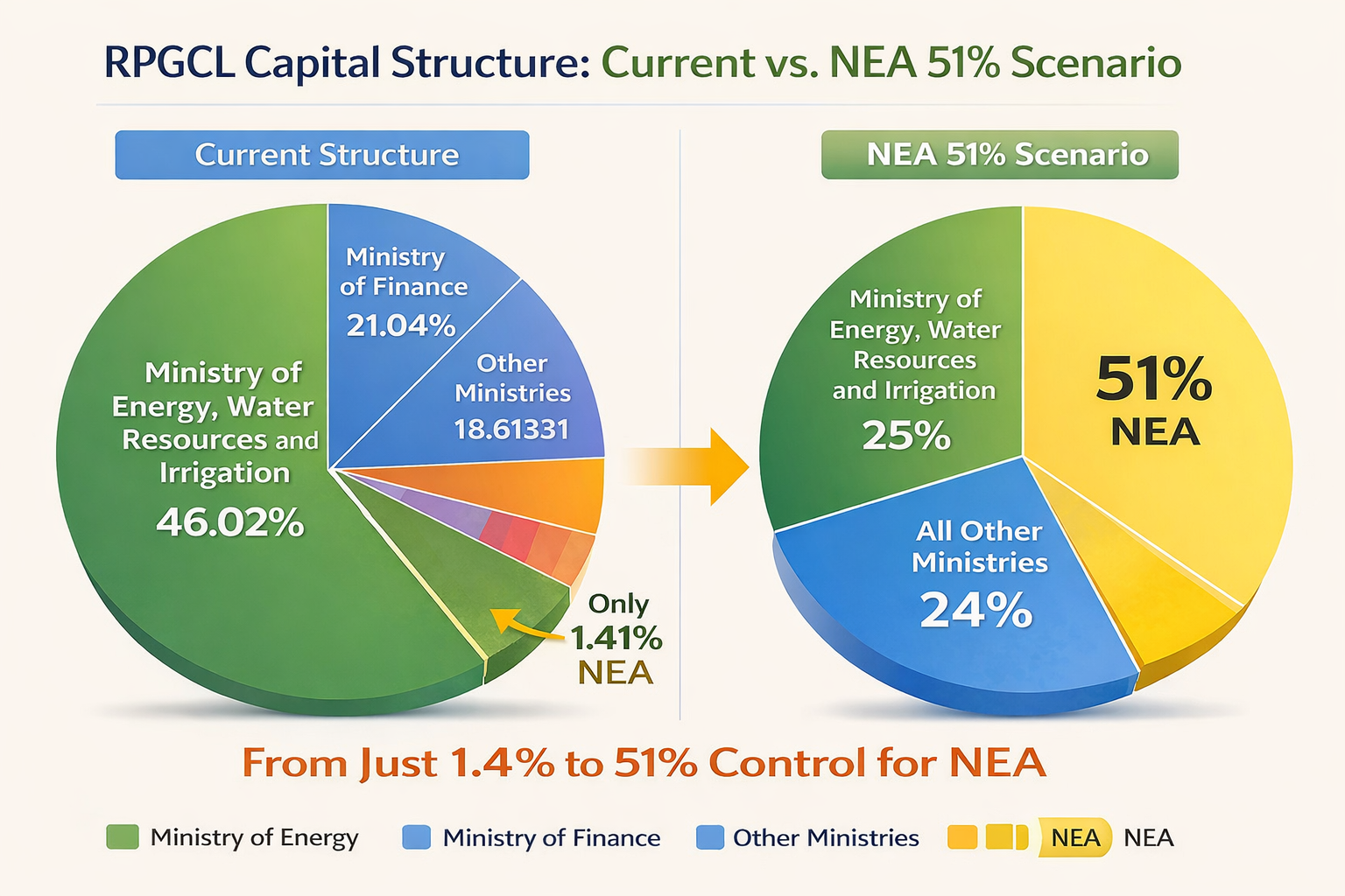 आरपीजीसीएलको पूँजी संरचनाले एउटा रोचक तर गम्भीर सत्य उजागर गर्छ— प्राधिकरणले यो कम्पनी “कब्जा” गर्न खोजे पनि, कागजमा हेर्दा प्राधिकरणको स्वामित्व हाल केवल १.४१ प्रतिशत मात्रै छ। प्राधिकरणले हाल आरजीपीसीएलमा कायम भएकाे शेयरअनुसार तिर्नुपर्ने रकम समेत दिएको छैन । सवा तीन अर्ब रुपैयाँ हाल्नुपर्नेमा ५ करोड मात्र तिरेको आरजीपीसीएलको वार्षिक प्रतिवेदनमा देखिन्छ ।