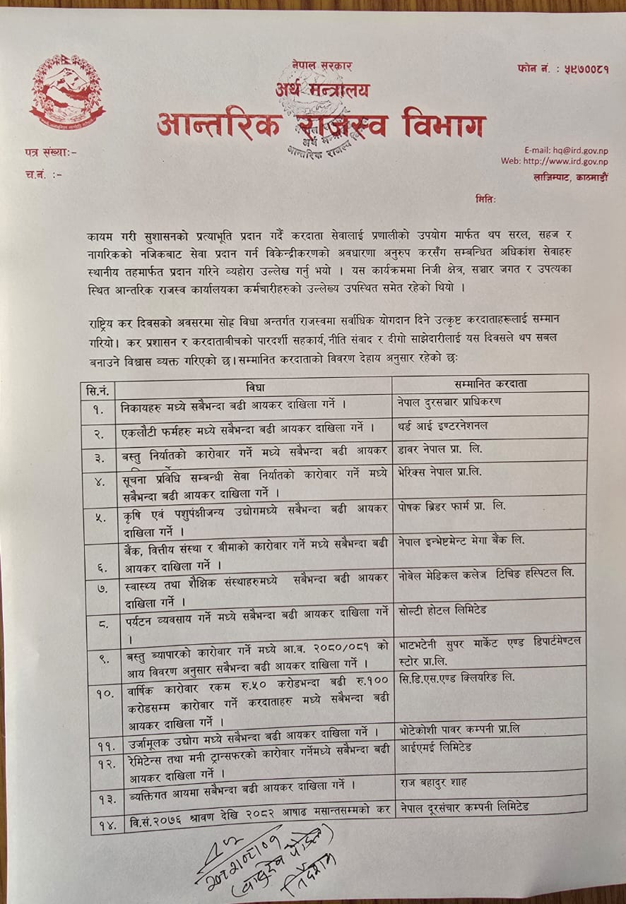 काठमाडौं – कर प्रशासनको पारदर्शिता, कर चुक्ता गर्ने संस्कृतिको प्रवर्द्धन र उत्कृष्ट करदाताको योगदानलाई सम्मान गर्न आन्तरिक राजस्व विभागले यस वर्ष पनि विभिन्न श्रेणीमा कर तिर्ने उत्कृष्ट करदाताहरूलाई सम्मान गरेको छ। विभागले सार्वजनिक गरेको सूचीनुसार १४ वटा शीर्ष करदाताले ‘उत्कृष्ट करदाता सम्मान’ प्राप्त गरेका छन्।