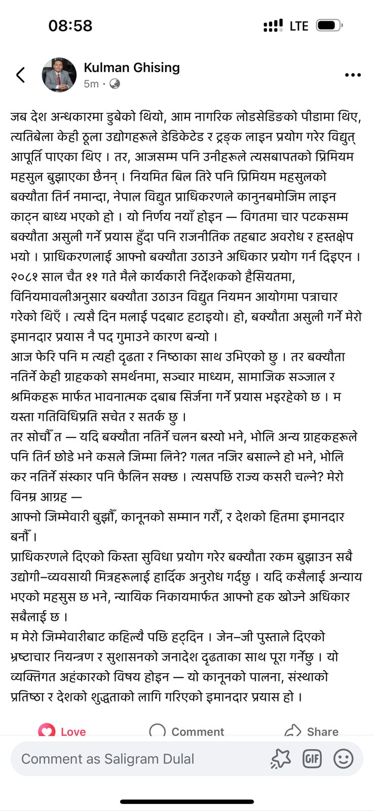 उनले लेखेका छन्, “२०८१ साल चैत ११ गते मैले कार्यकारी निर्देशकको हैसियतमा, विनियमावलीअनुसार बक्यौता उठाउन विद्युत् नियमन आयोगमा पत्राचार गरेको थिएँ। त्यसै दिन मलाई पदबाट हटाइयो। बक्यौता असुली गर्ने मेरो इमानदार प्रयास नै पद गुमाउने कारण बन्यो।”