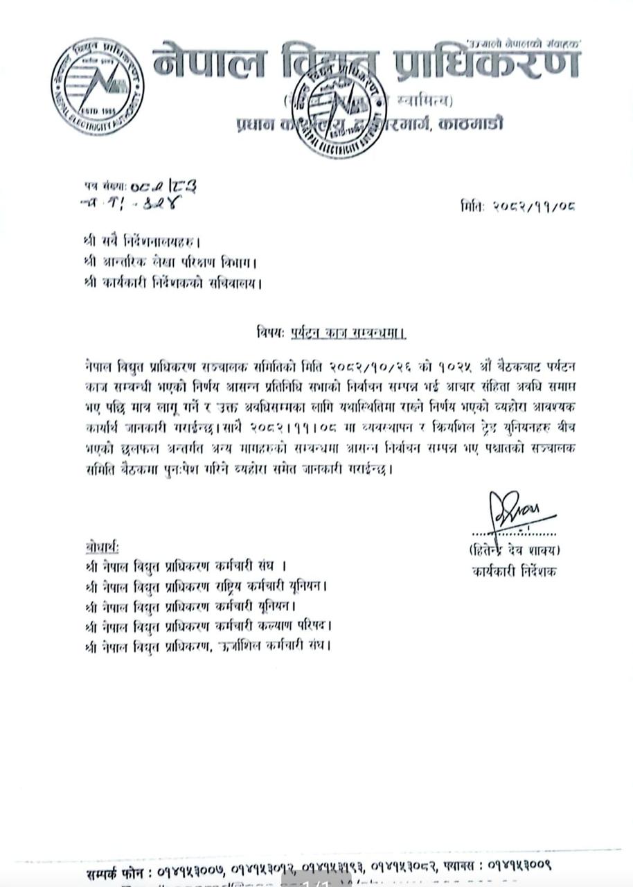 ट्रेड युनियनको दबाबपछि नेपाल विद्युत् प्राधिकरणले पर्यटन काजसम्बन्धी निर्णय सच्यायो (पत्रसहित)
