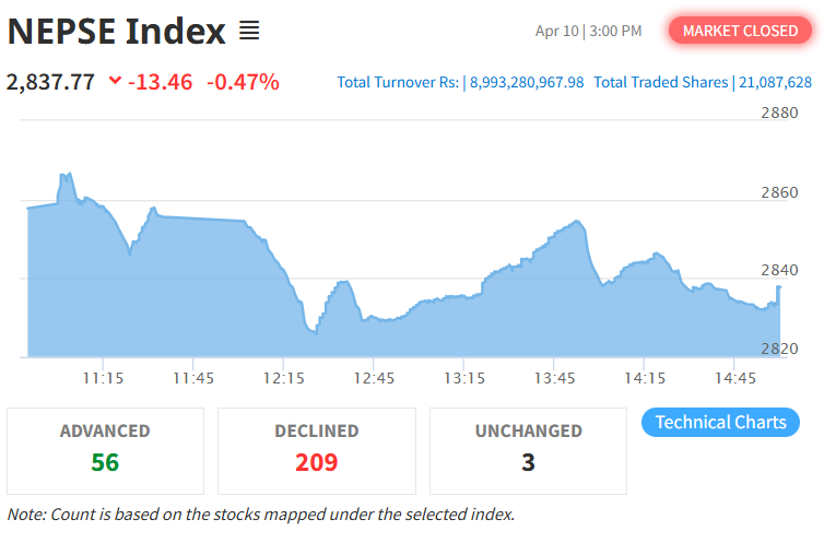 नेप्से सामान्य अंकले घट्यो, कारोबार रकम पनि घट्दै ८ अर्ब ९९ करोडमा सीमित