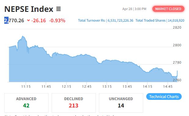 नेप्से २६ अंकले घट्यो, कारोबार रकम भने ६ अर्ब नाघ्यो