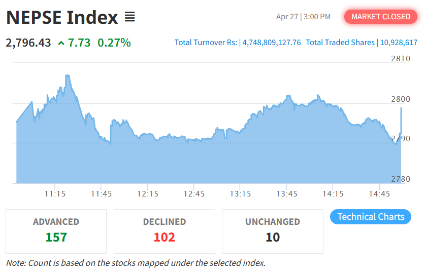 यस दिन नेप्से परिसूचक ७.७३ अंकले बढेर २७९६.४३ विन्दुमा पुगेको छ । यस्तै, सेन्सेटिभ इण्डेक्स १.६४ अंकले बढ्दा फ्लोट इण्डेक्स ०.७५ अंक र सेन्सेटिभ फ्लोट इण्डेक्स ०.६१ अंकले वृद्धि भएको छ ।