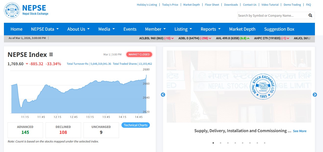 नेप्सेमा गिरावट, करिब रु. ४ अर्बभन्दा बढीको कारोबारसँग बजार दबाबमा
