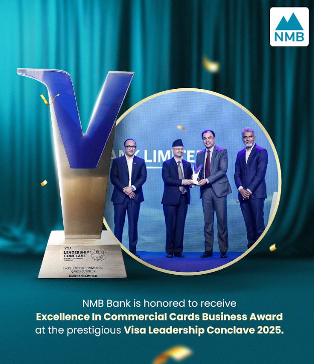 काठमाडौँ : एनएमबि बैंकले भिसा इन्टरनेशनलद्वारा सम्पन्न “डिजिटल पेमेंट लिडरशिप समिट”-मा Digital Payment Growth Award प्राप्त गरेको छ। बैंकले व्यावसायिक कार्ड (Commercial Card) क्षेत्रमा गरेको उत्कृष्ट प्रदर्शन तथा डिजिटल भुक्तानी प्रवर्द्धनमा दिएको महत्वपूर्ण योगदानको सम्मानस्वरुप उक्त अवार्ड प्रदान गरिएको भिसाले जनाएको छ।