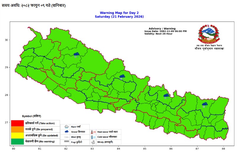 विभागले सार्वजनिक गरेको ‘वार्निङ म्याप फर डे-२’ अनुसार मुलुकभर हरियो संकेत (No Warning) देखिएको छ, जसले हाल तत्काल कुनै जोखिमयुक्त मौसमी प्रणाली सक्रिय नरहेको संकेत गर्छ।