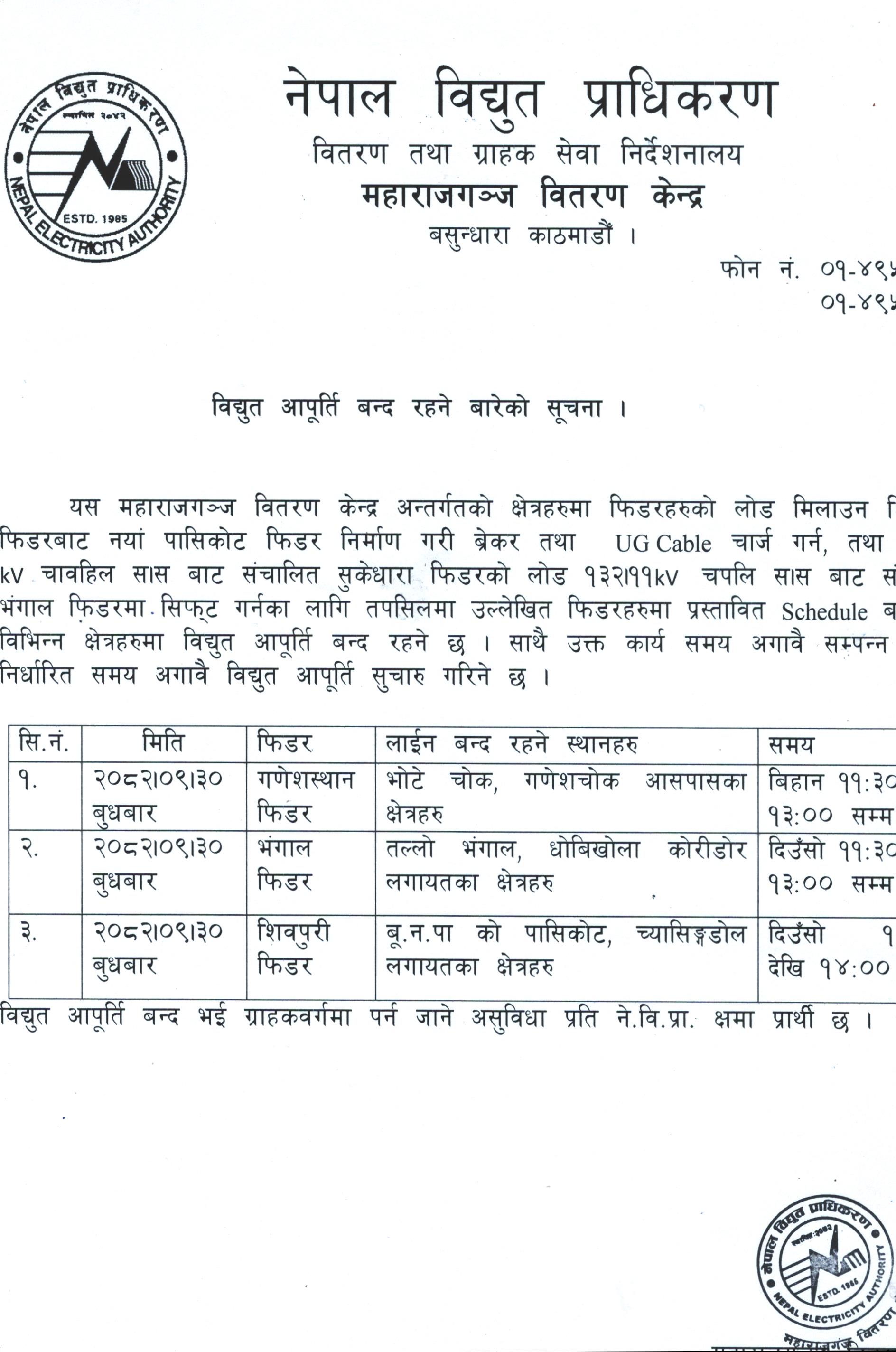 प्राधिकरणका अनुसार गणेशस्थान फिडर, भङ्गाल फिडर र शिवपुरी फिडर मातहतका क्षेत्रमा आज निर्धारित समयसम्म बिजुली कटौती हुनेछ। फिडरको भार (लोड) व्यवस्थापन गर्न तथा नयाँ पासिकोट फिडर निर्माण गरी ब्रेकर र भूमिगत तार चार्ज गर्ने प्रयोजनका लागि विद्युत् कटौती गर्न लागिएको प्राधिकरणले जनाएको छ ।