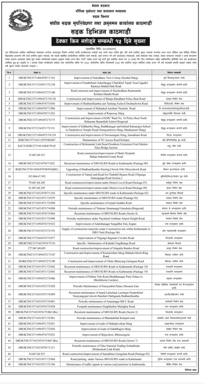 सडक डिभिजन काठमाडौंले ४८ ठेक्का तोड्ने प्रक्रिया अघि बढायो