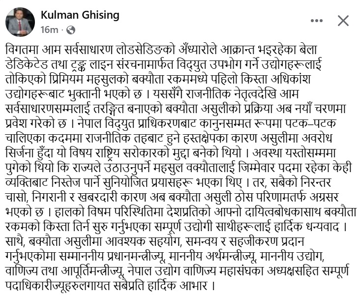 उनले थप लेखेका छन्, “नेपाल विद्युत् प्राधिकरणबाट कानुनसम्मत रूपमा पटक–पटक चालिएका कदमहरूमा राजनीतिक तहबाट हुने हस्तक्षेपका कारण असुलीमा अवरोध सिर्जना हुँदा यो विषय राष्ट्रिय सरोकारको मुद्दा बनेको थियो । तर सबैको निरन्तर चासो, निगरानी र खबरदारीका कारण अब बक्यौता असुली ठोस परिणामतर्फ अग्रसर भएको छ ।”
