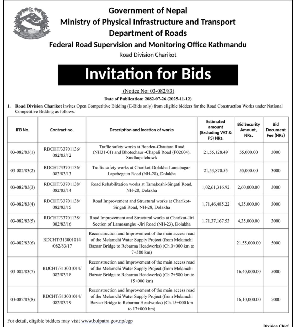 ऊर्जा, जलस्रोत तथा सिँचाइ, भौतिक पूर्वाधार तथा यातायात तथा शहरी विकास मन्त्री कुलमान घिसिङको उपस्थितिमा मंगलबार खानेपानी मन्त्रालय र मेलम्ची खानेपानी आयोजनाका सरोकार समितिहरूबीच भएको समझदारी कार्यान्वयनका क्रममा सडक डिभिजन कार्यालय, चरिकोटले टेण्डर आह्वान गरेको हो ।