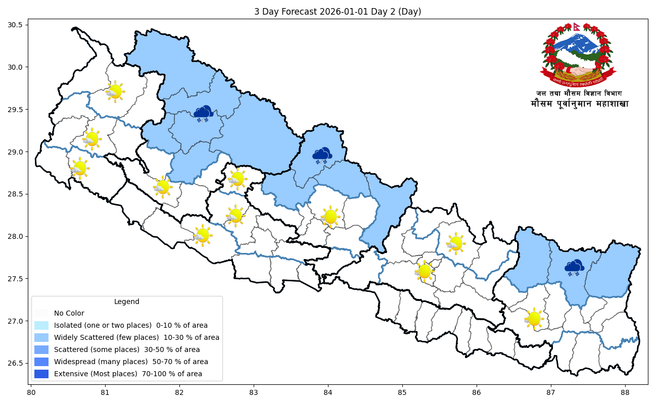 यसैगरी, कोशी, गण्डकी, कर्णाली र सुदूरपश्चिम प्रदेशका उच्च पहाडी तथा हिमाली क्षेत्रका एक–दुई स्थानमा हल्का वर्षा वा हिमपातको सम्भावना रहेको महाशाखाको पूर्वानुमान छ ।