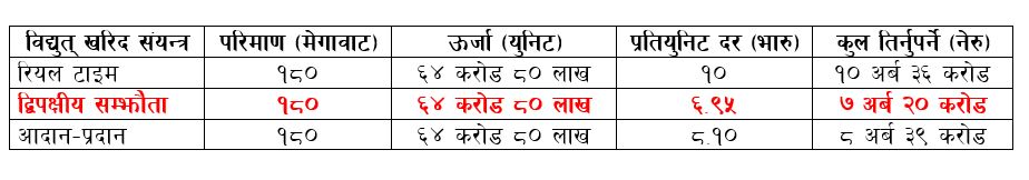 माथि दिइएको टेबलमा प्राधिकरणले खरिद गर्न लागेको द्विपक्षीय सम्झौताबाट हो । यसअनुसार प्राधिकरणले आयात गर्ने कुल बिजुलीको लागत (ल्यण्डेड प्राइसमा) ७ अर्ब २० करोड रुपैयाँ हो । यी तीनवटा संयन्त्रमध्ये सबैभन्दा सस्तो द्विपक्षीय सम्झौता रहेको छ ।