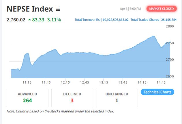 हाइड्रोपावर समूहको बलियो साथ पाएपछि दोहोरो अंकले बढ्यो शेयर बजार