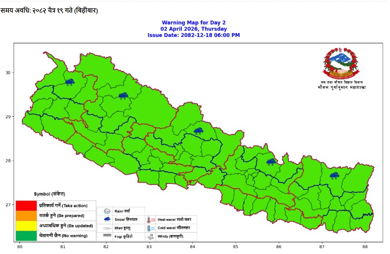 विभागका अनुसार देशभर हरियो संकेत देखिएकोले हाल ‘कुनै चेतावनी आवश्यक नरहेको’ अवस्था रहेको छ। यद्यपि, नक्शामा देखाइएको संकेतअनुसार केही स्थानहरूमा हल्का वर्षा तथा हिमपातको सम्भावना भने रहेको छ।