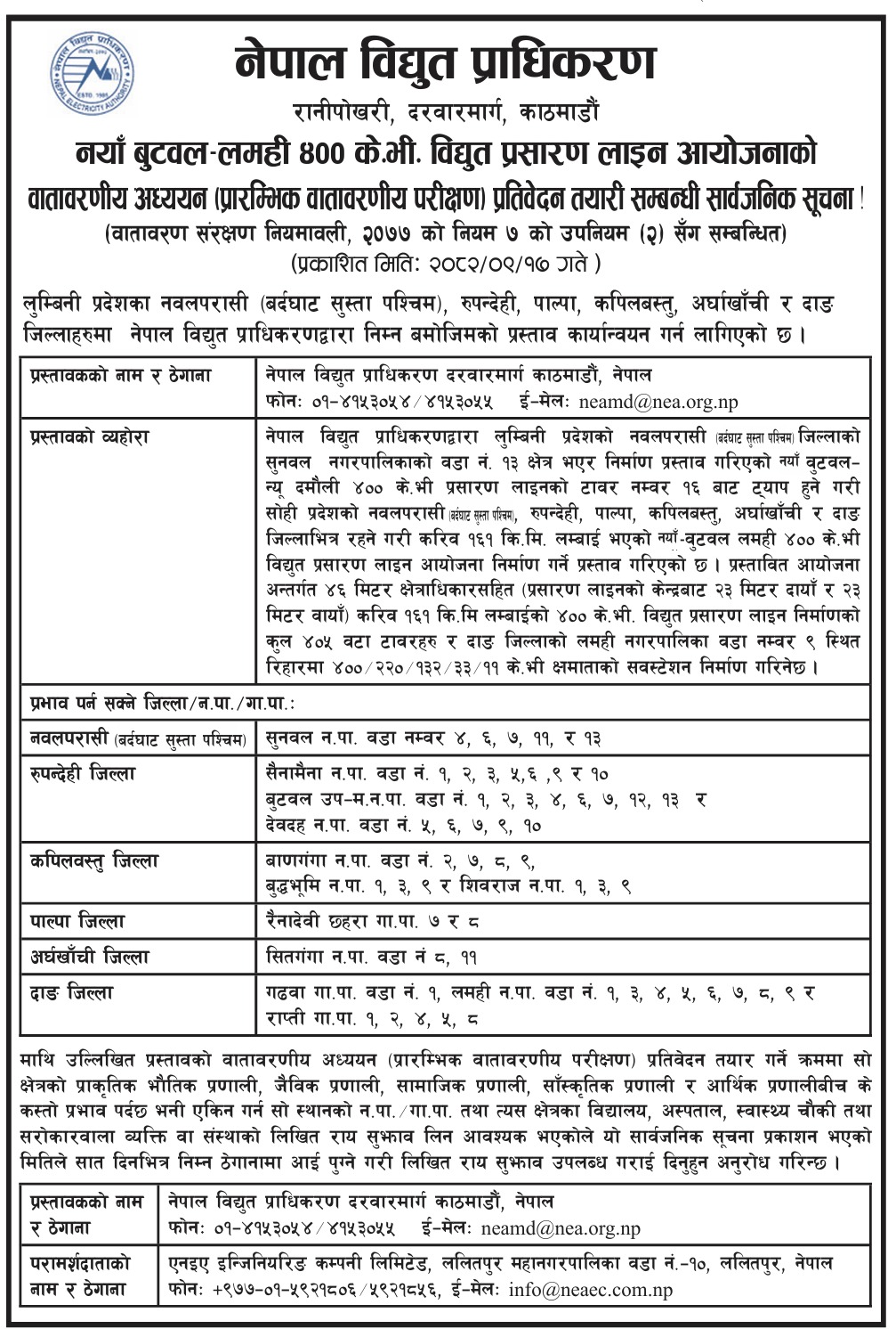 अघि बढ्यो नयाँ बुटवल–लमही ४०० केभी प्रसारण लाइन आयोजनाको काम, वातावरणीय अध्ययन प्रतिवेदनबारे सार्वजनिक सूचना
