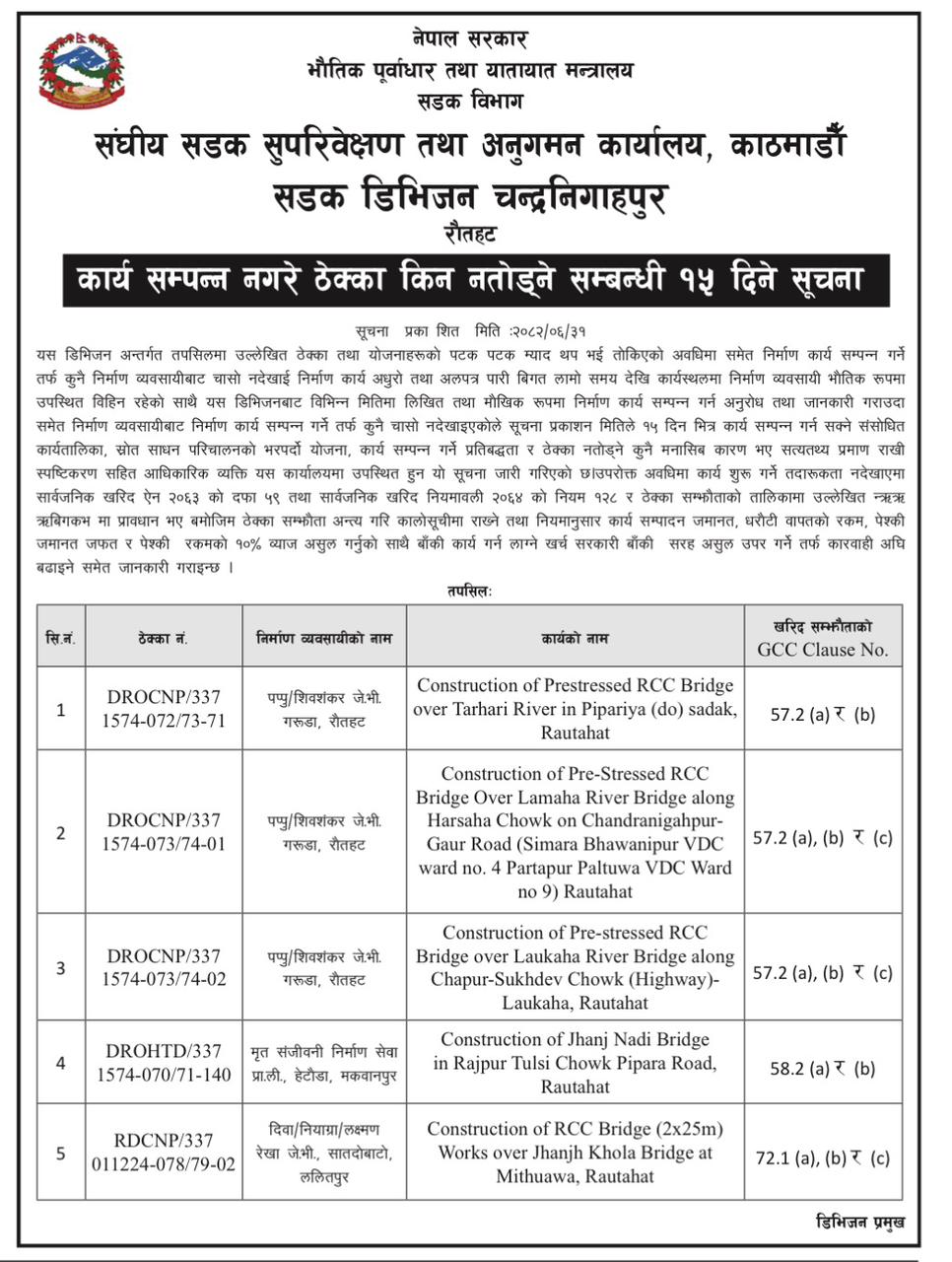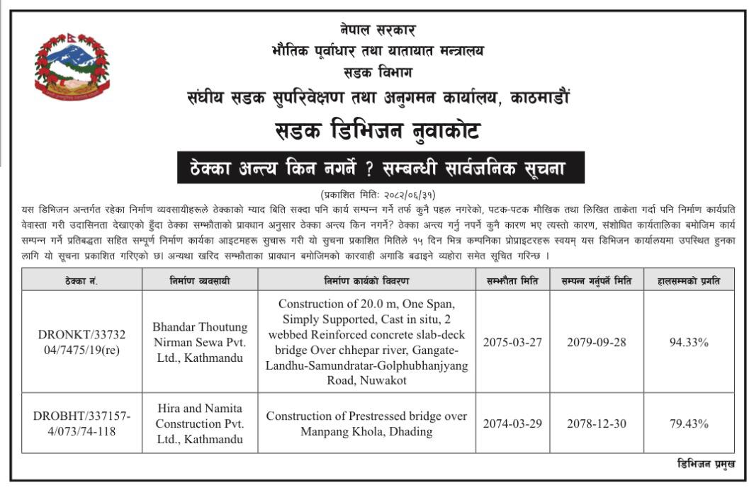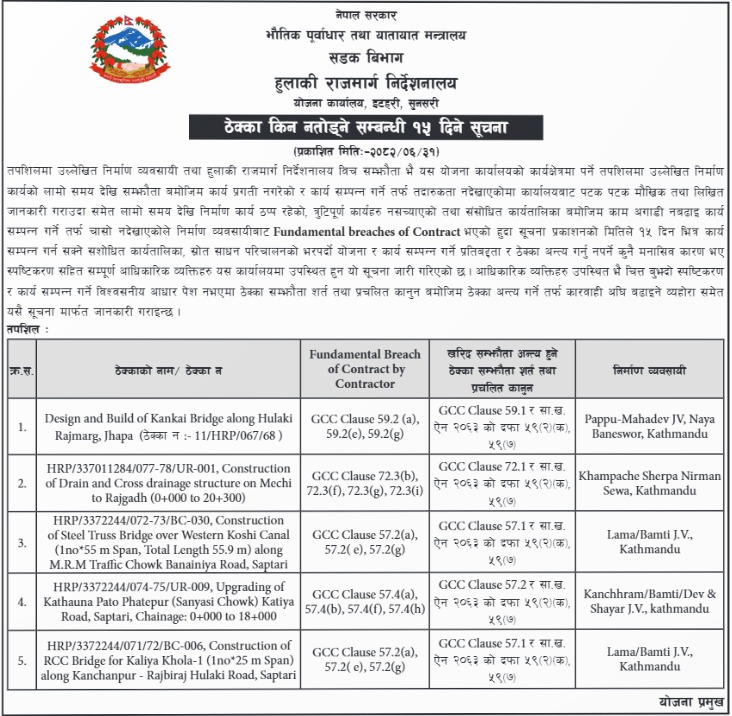 सडक विभागअन्तर्गत हुलाकी सडक निर्देशनालय, संघीय सडक सुपरीवेक्षण तथा अनुगमन कार्यालय काठमाडौं र इटहरी मातहतका सडक डिभिजन कार्यालयहरूले शुक्रबार सार्वजनिक सूचना जारी गर्दै ती ठेक्का किन नतोड्ने भन्ने विषयमा ठेकेदारलाई १५ दिनभित्र स्पष्टीकरण पेश गर्न आह्वान गरेका छन् ।
