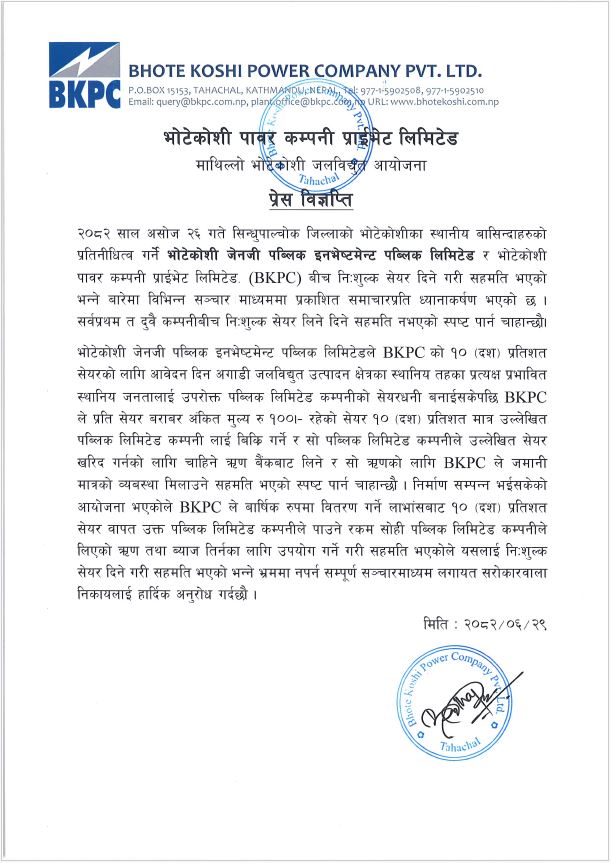 बुधबार कम्पनीले जारी गरेको प्रेस विज्ञप्तिमा २०८२ साल असोज २६ गते सिन्धुपाल्चोक जिल्लाको भोटेकोशीका स्थानीय बासिन्दाहरूको प्रतिनिधित्व गर्ने भोटेकोशी जेनजी पब्लिक इनभेष्टमेन्ट पब्लिक लिमिटेड र भोटेकोशी पावर कम्पनी प्रा.लि. बीच कुनै पनि किसिमको निःशुल्क सेयर दिने–लिने सहमति नभएको बताइएको छ ।